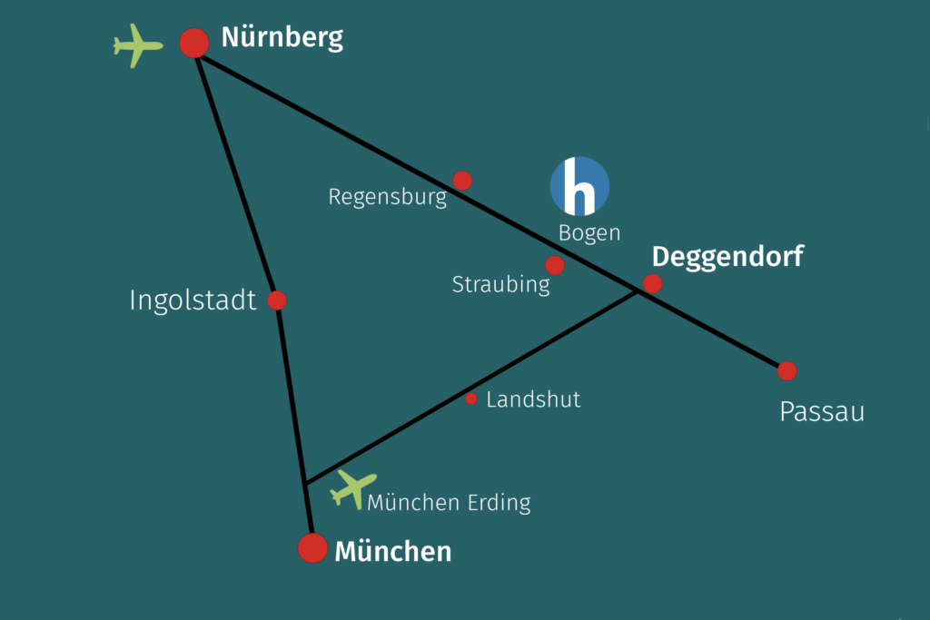 - Bogen/Straubing ist via Autobahn aus den Richtungen Nürnberg/Regensburg (A3), München (A92) und Passau (A3) gut erreichbar.